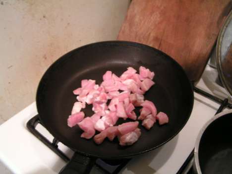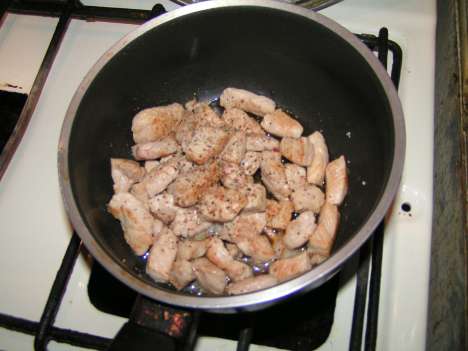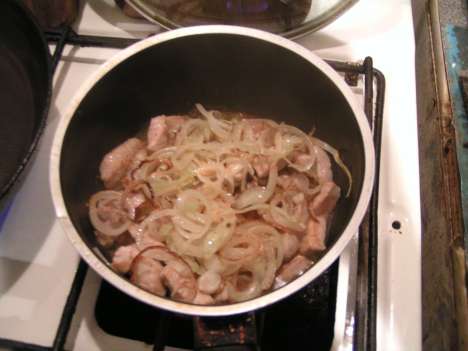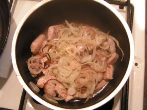 На раскаленную сковороду выкладывается срезанный жир от свинины, а затем и сама свинина. Если вам кажется, что так будет слишком сухо и все пригорит, добавьте масла. Но не слишком много. Свинину, постоянно помешивая, надо довести до состояния легкого подрумянивания, после чего отправить в сотейник.