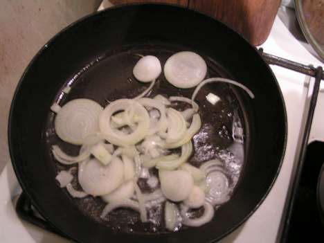 Я надеюсь, что вы и без меня догадались включить под сотейником огонь. Закройте мясо крышкой и начинайте жарить лук. Его тоже можно подрумянить на сухой сковороде, а можно - на масле или в жире. Но маргарин, пожалуй, совсем не подойдет.