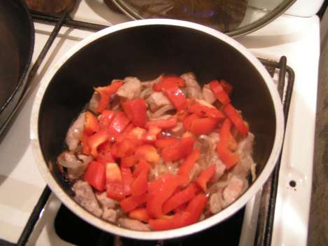 Когда лук станет золотистым, положите его к мясу и перемешайте. Пусть потушатся вместе, а вы тем временем на той же сковородке обжарьте сладкий перец. И его туда же, в сотейник, к мясу и луку. Теперь потушите блюдо еще минут десять и аккуратно - не обожгитесь! - попробуйте. В принципе, должно уже быть готово, но если нет - потушите еще.